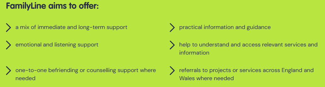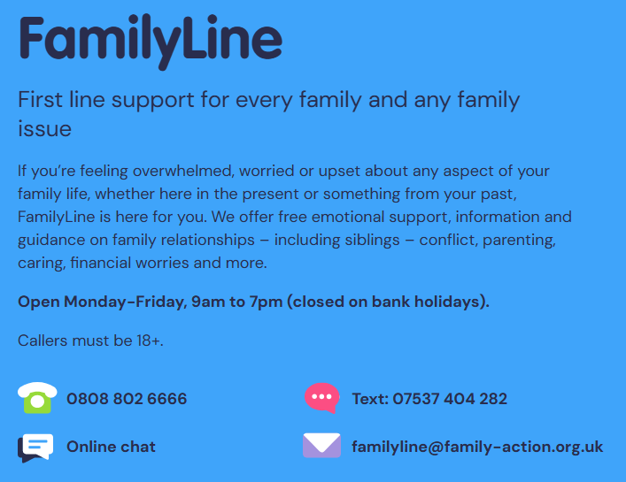 Please find below information about the organisation, FamilyLine, which offers free emotional support, information and guidance on family relationships – including siblings – conflict, parenting, caring, financial worries and more.